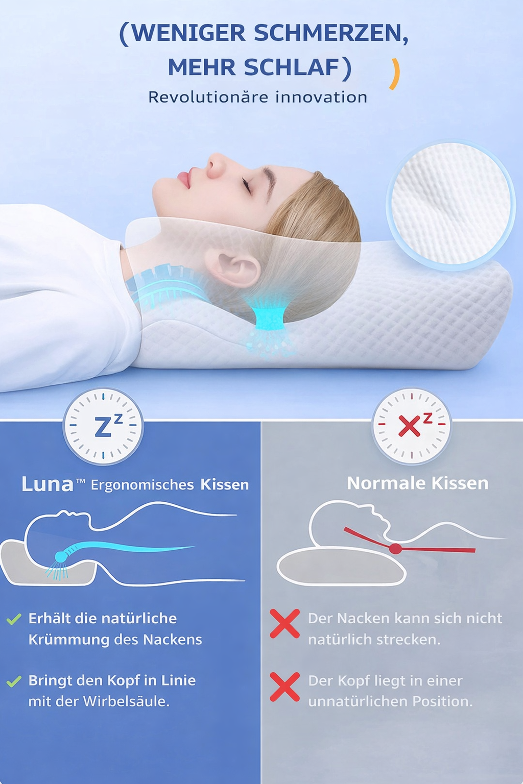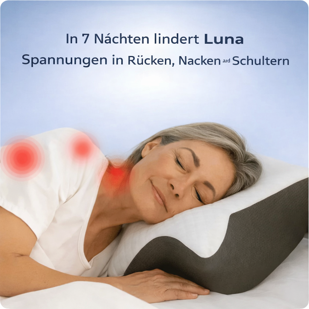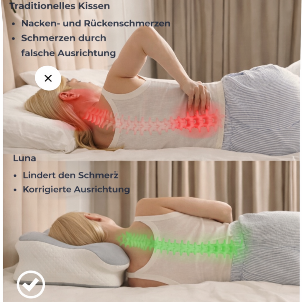 ''Viele Nacken- und Schulterschmerzen entstehen durch eine falsche Schlafhaltung und unzureichende Unterstützung von Kopf und Nacken. Das Luna Ergonomisches Kissen unterstützt deinen Kopf und Nacken auf die richtige Weise, fördert die Offenheit der Atemwege und hilft, Schnarchen zu reduzieren. So kannst du entspannt schlafen, ohne schmerzhaft aufzuwachen, und besser atmen während der Nacht. Eine Empfehlung für alle, die Beschwerden vermeiden oder reduzieren und erfrischt aufwachen möchten.''