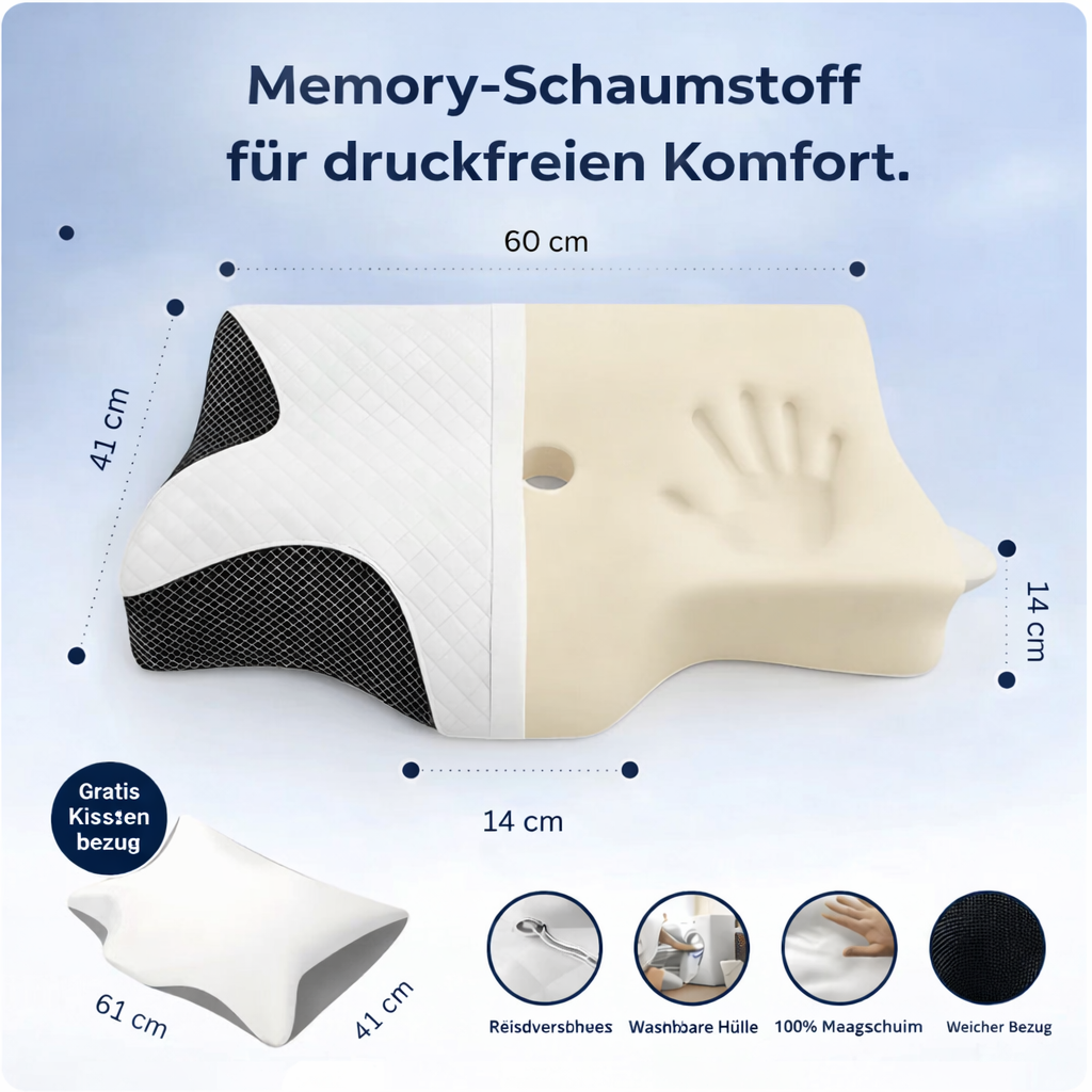 Das Luna Kissen ist nicht einfach nur ein Kopfkissen. Dank des fortschrittlichen Schmetterling-Höhlen-Designs passt sich das Kissen exakt den Konturen deines Körpers an. Egal, ob du ein Seiten-, Rücken- oder Bauchschläfer bist, dieses Kissen zwingt deine Wirbelsäule in eine natürliche, neutrale Position, wodurch Druckpunkte direkt entlastet werden.