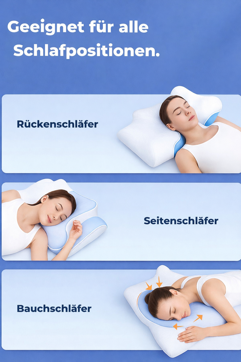 Endlich ohne Nackenschmerzen aufwachen. Das einzige Kissen, das sich an deine Schlafposition anpasst!