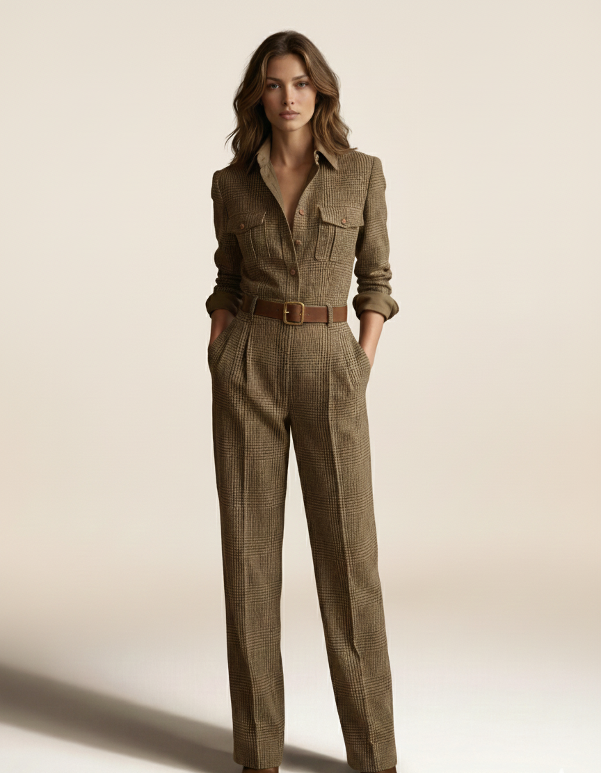 Der Helga Jumpsuit vereint klassischen Tweed-Charme mit einer modernen, klaren Silhouette. Das erdige Karomuster wirkt zugleich raffiniert und selbstbewusst, während Details wie der vegane Ledergürtel und die utilitaristisch inspirierten Taschen einen harmonischen Ausgleich zwischen femininer Eleganz und urbaner Stärke schaffen. Ein mühelos stilvoller Look – ideal fürs Büro, City-Outings oder elegante Alltagsmomente.